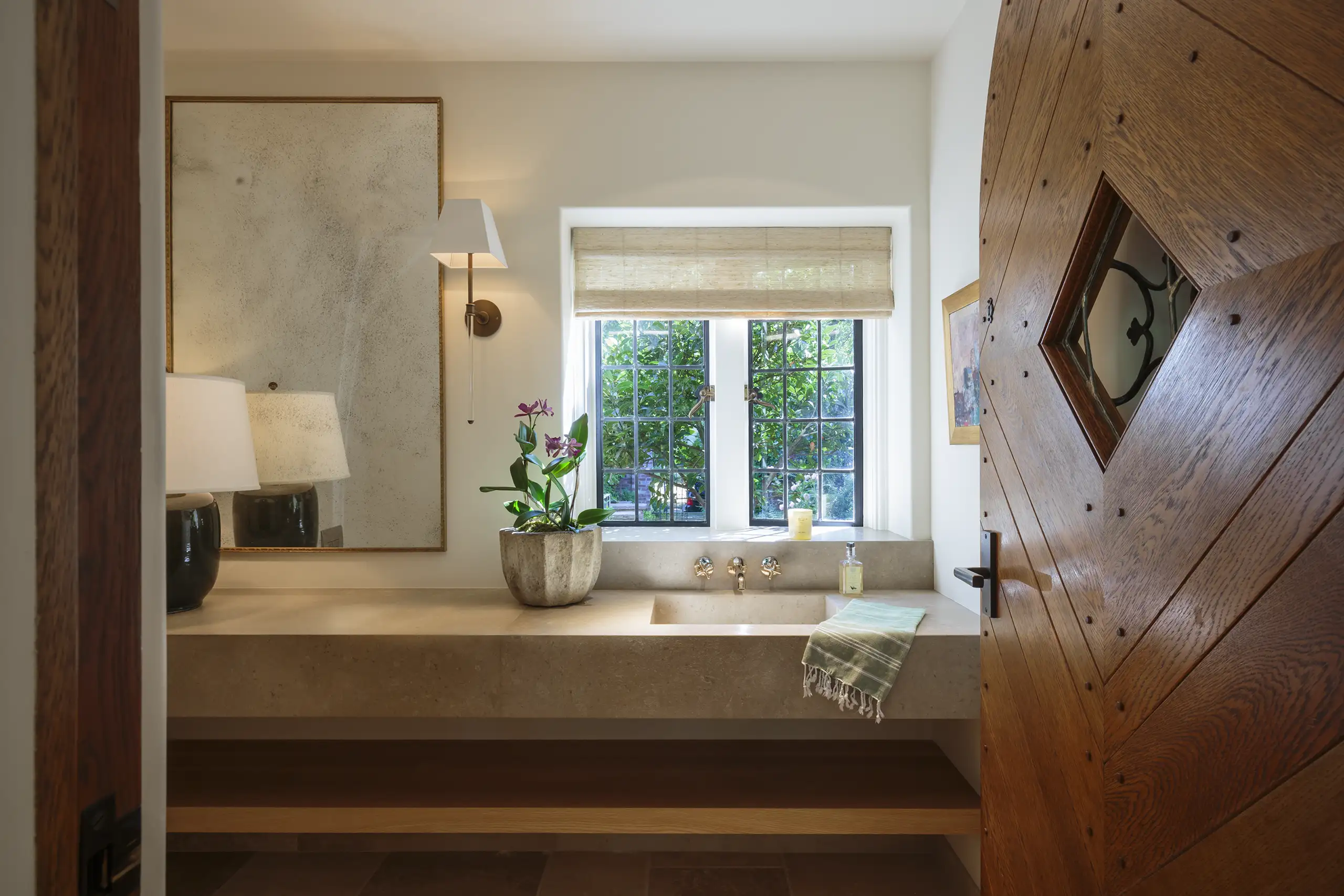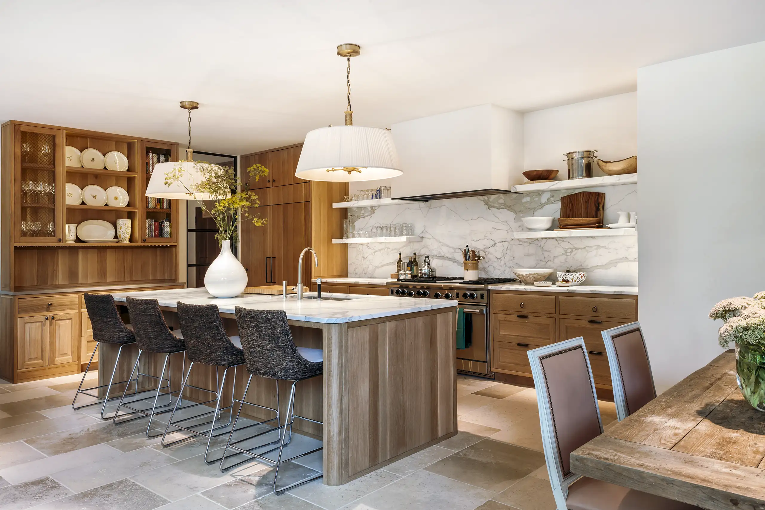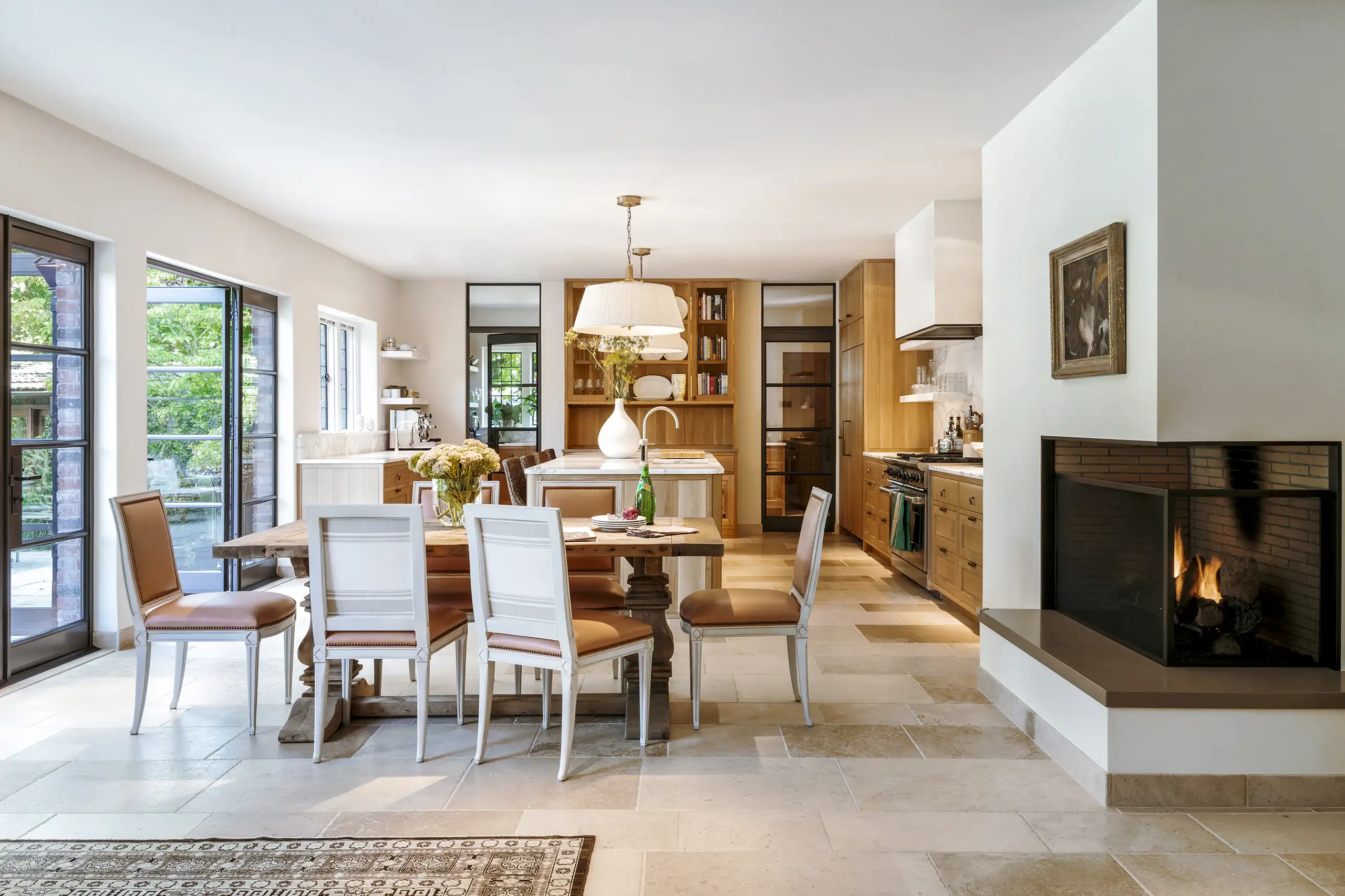 Embracing a contemporary vision, the transformation has redefined the layout, opening formerly confined spaces into an expansive kitchen, butler’s pantry, powder room, and family room. The kitchen and butler’s pantry feature marble countertops, custom cabinetry, and new appliances. Decorative pendant lighting adds a touch of softness and elegance above the island. The powder room blends old-world charm with modernity and the inviting family room is designed to enhance daily living while fostering a sense of cohesion and warmth.