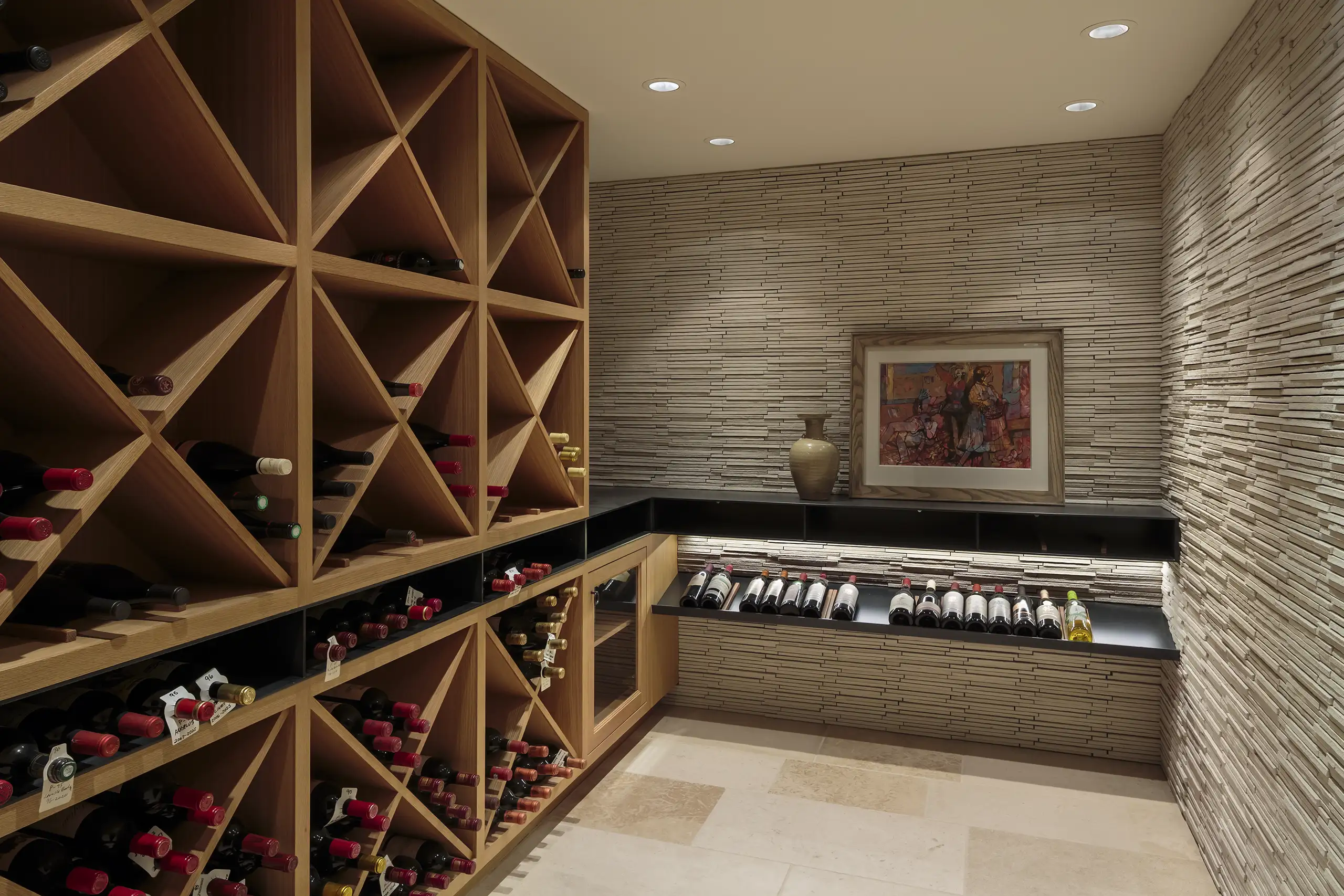 The lower level introduces amenities that promote both wellness and leisure. A home gym encourages an active lifestyle, while the spa—complete with a tranquil Japanese soaking tub surrounded by teak finishes and soft LED lighting—offers a serene retreat. The thoughtfully designed wine room features temperature-controlled storage with ambient lighting and natural stone, catering to the connoisseur’s passion for fine vintages.