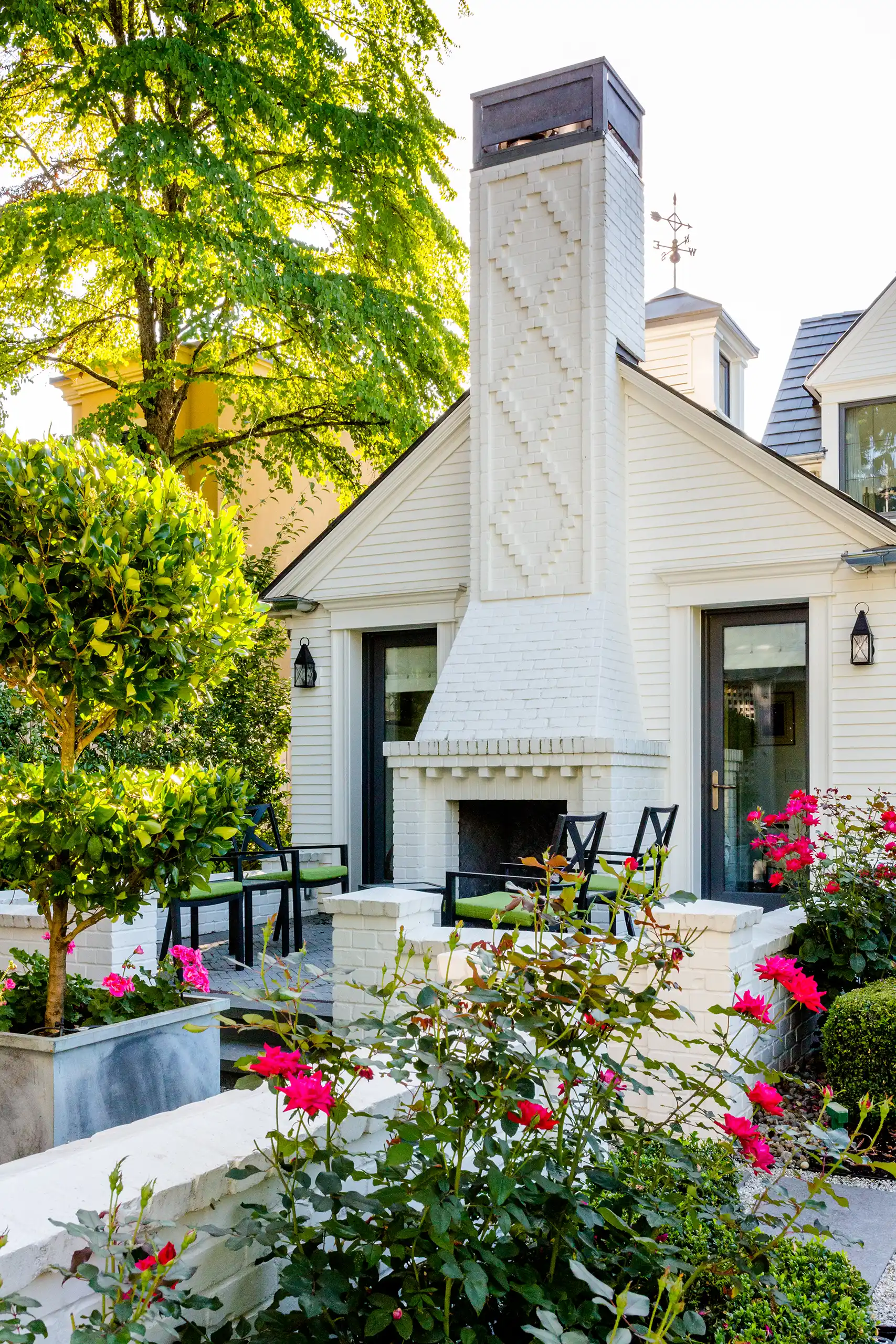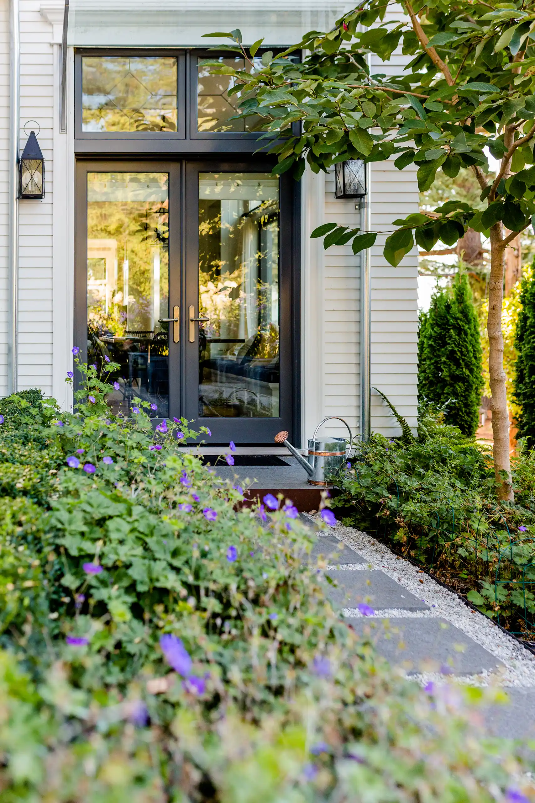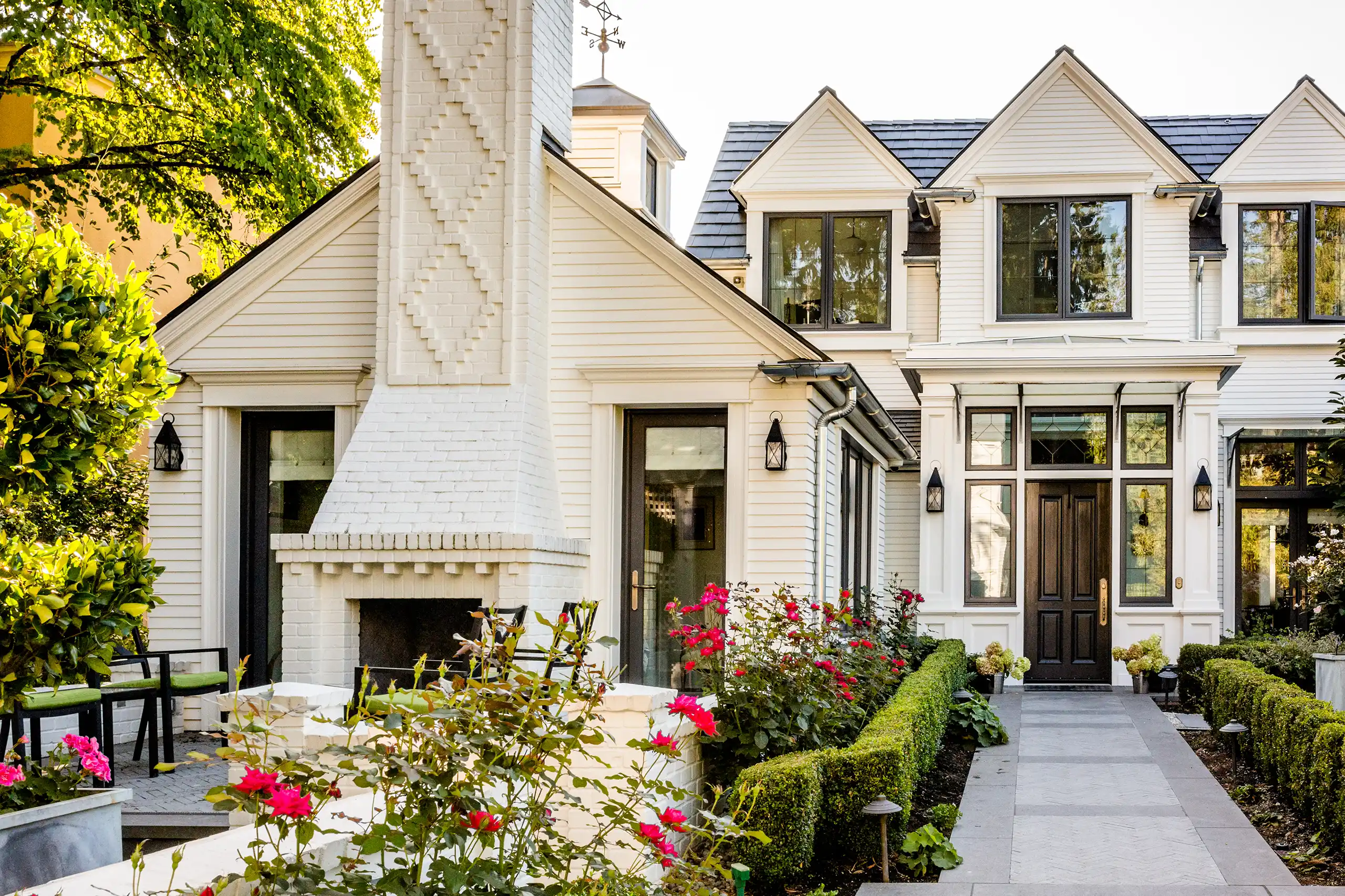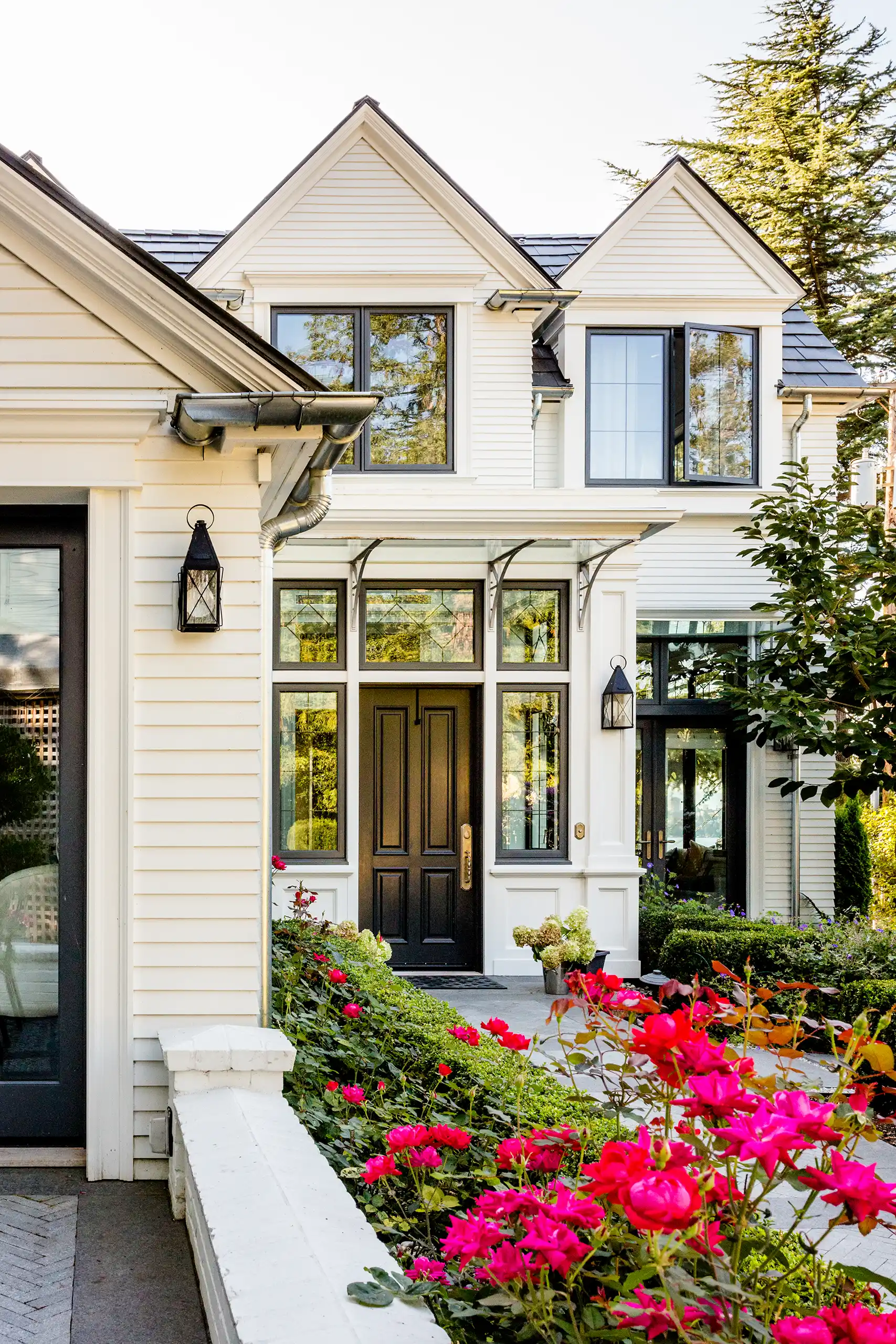 Narrow lap white siding, painted reclaimed brick, and dark painted leaded doors and windows serve as the backdrop for lush greenery and vibrant colored flowers. Classic detailing, evident craftsmanship, and quality materials are assembled with advanced building sciences to allow this new old home to endure and perform for another century to come.