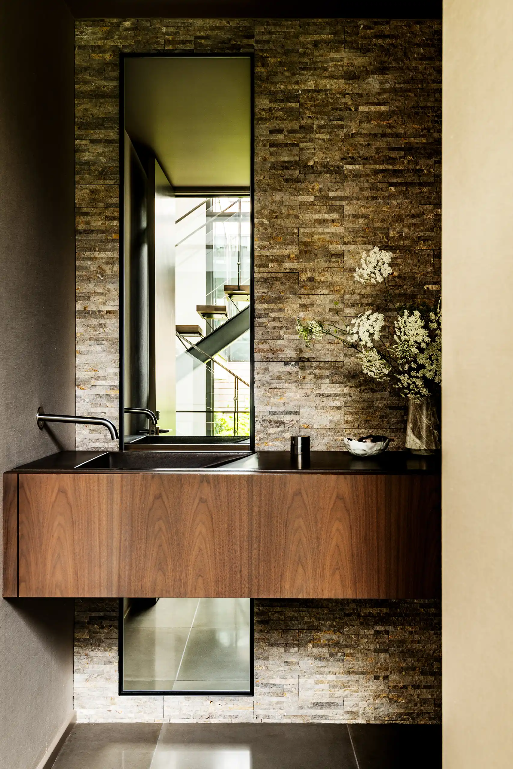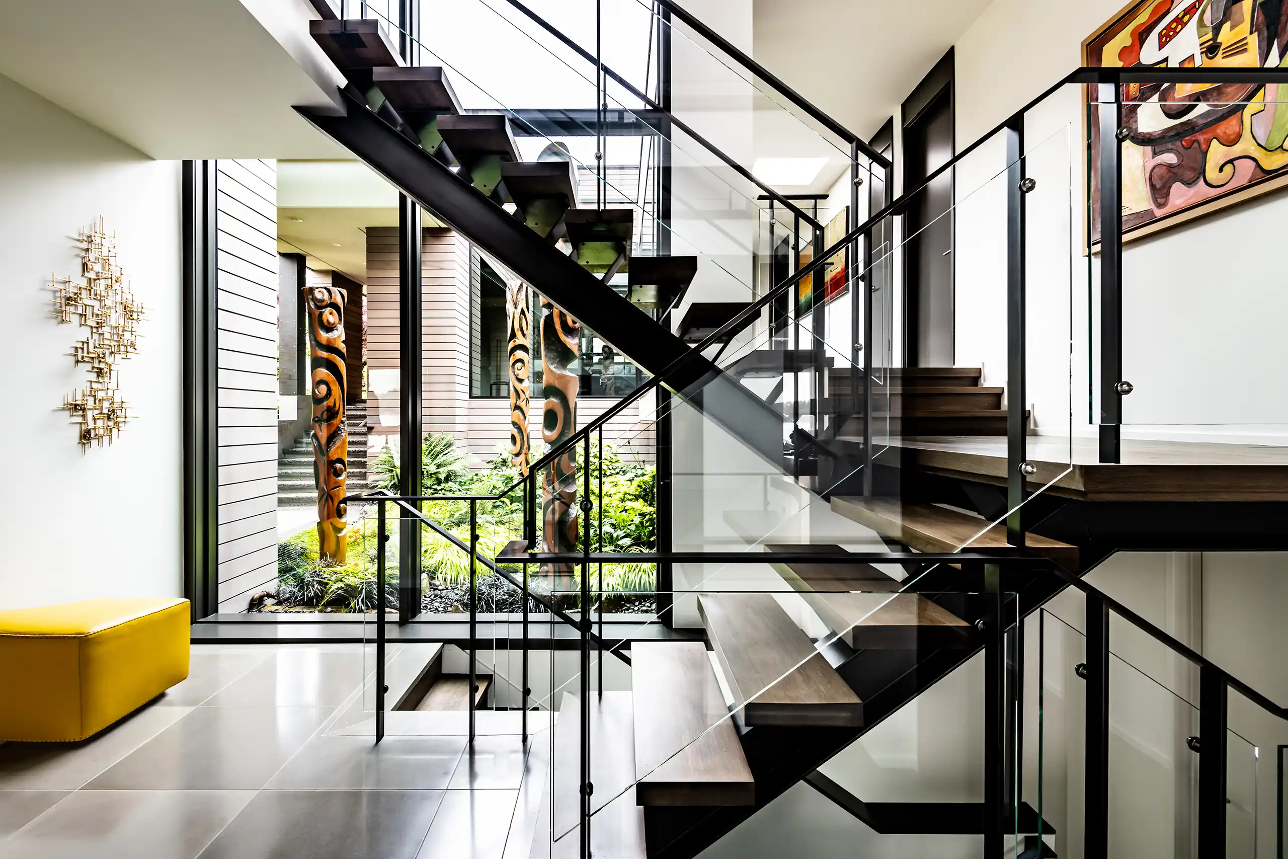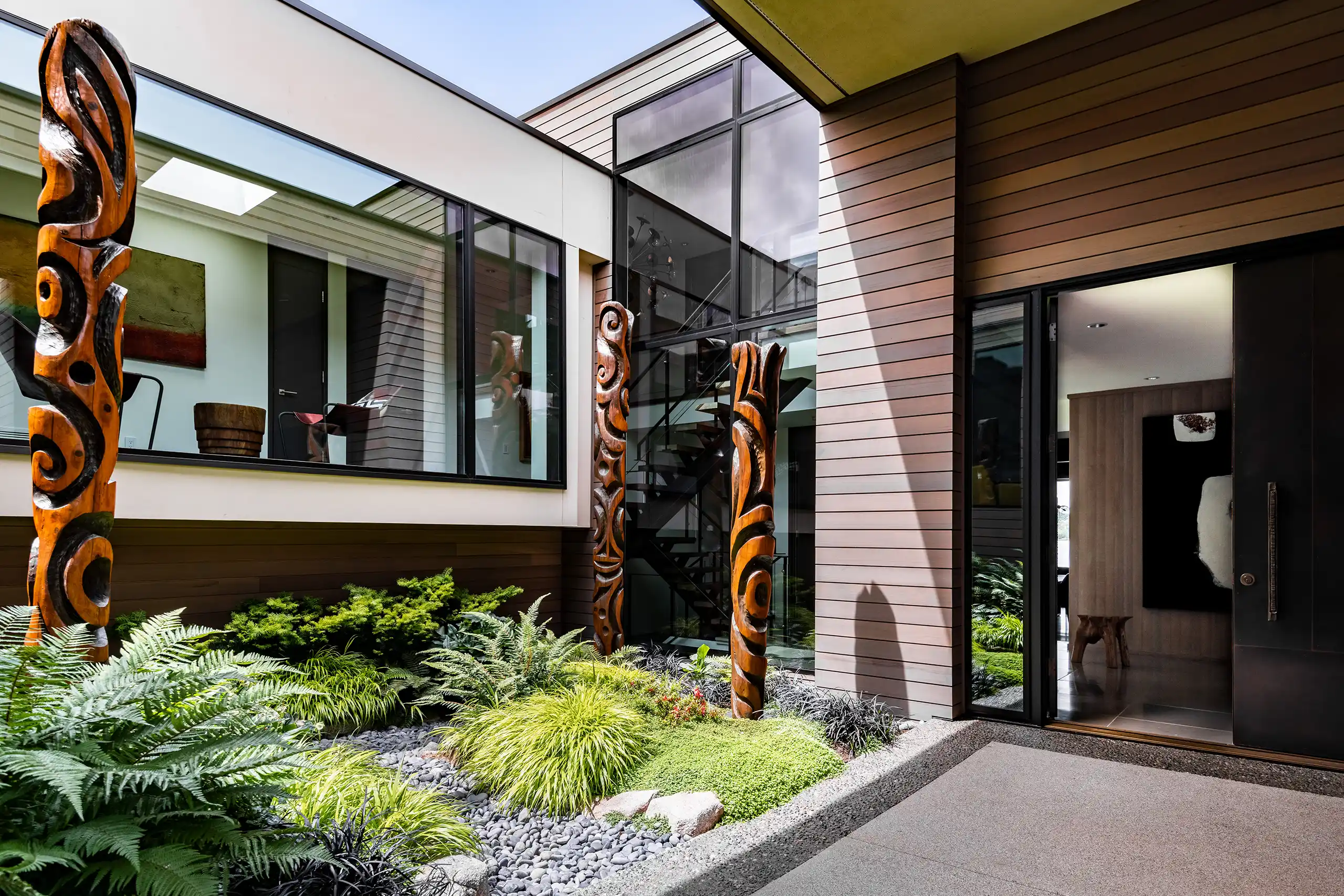 This residence, just steps from the shoreline, artfully harmonizes with its coastal surroundings, inviting the beauty of nature indoors. A comprehensive renovation transformed a previously enclosed layout into a serene, open oasis filled with light. The challenge of integrating seven distinct levels into a seamless flow of spaces was met with thoughtful design that pays homage to the home’s cherished 1970s architectural roots.