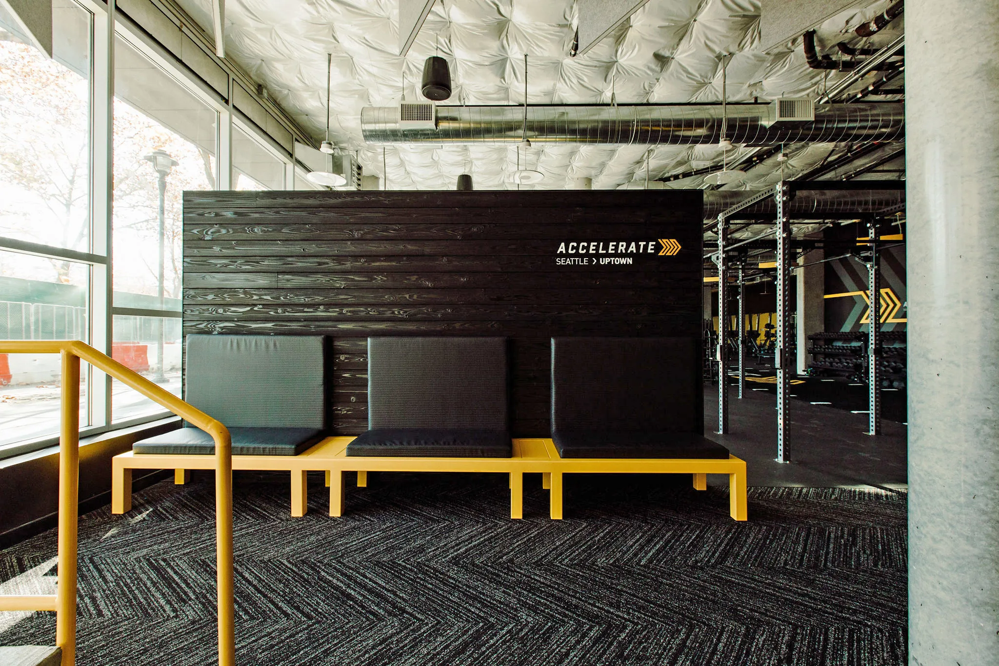 Situated across from Key Arena at the vibrant Seattle Center, Accelerate’s new gym embodies a bold vision of collective strength and dynamic training. Tasked with creating a space that champions team-oriented workouts, the design integrates striking graphics and a powerful palette of black and yellow, harmonized with charred ‘yakisugi’ siding that adds a contemporary edge.